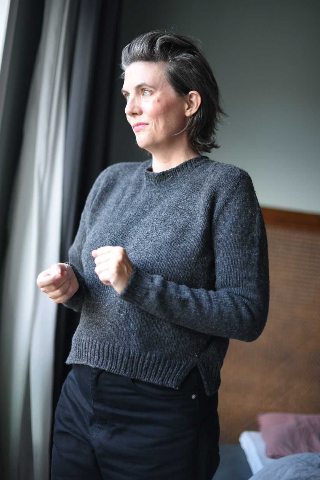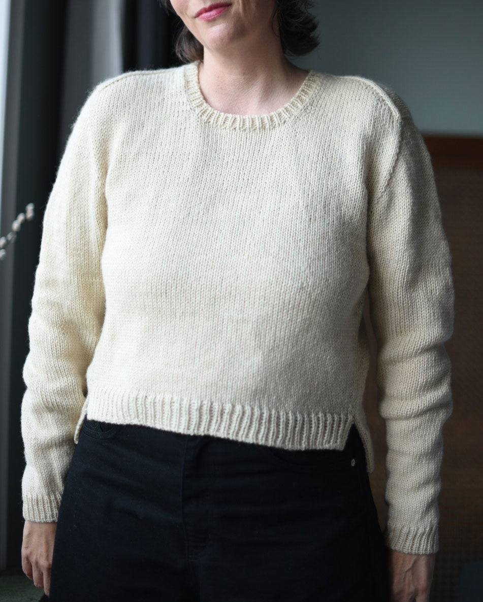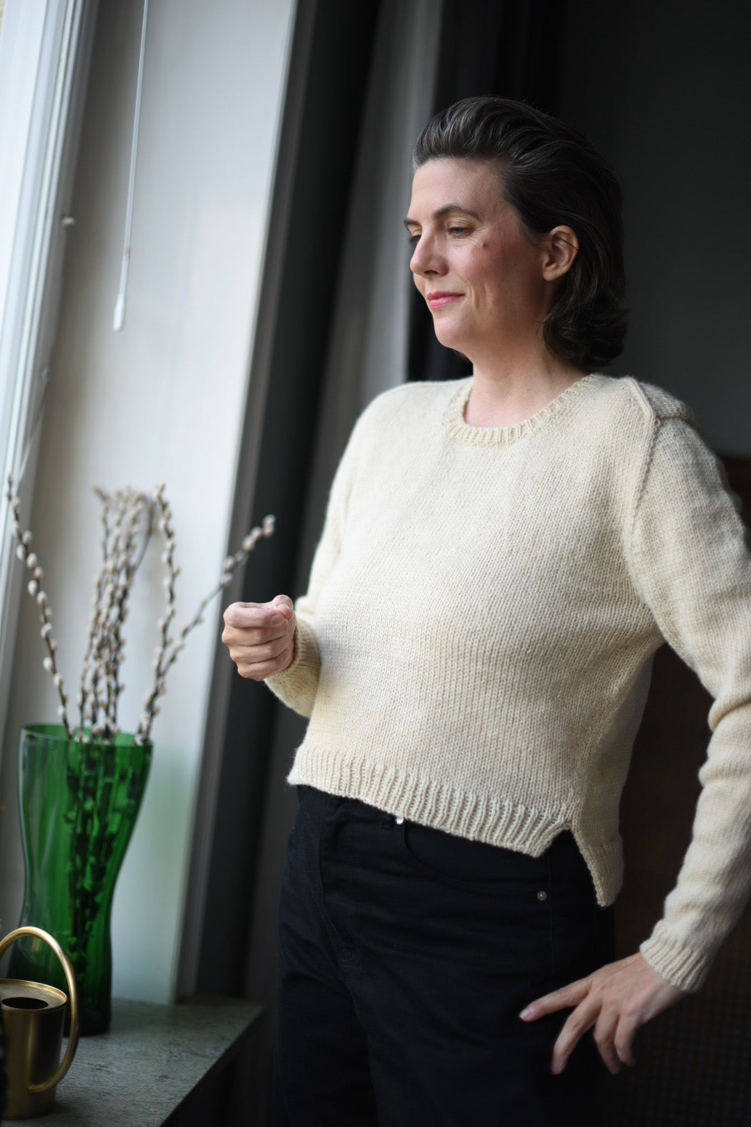 Tröjan stickas uppifrån och ner i ett stycke, med början vid halsringningen. Axellinjerna är integrerade i designen för att skapa struktur. Kropp och ärmar separeras efter oket, och kroppen avslutas med en sprundkant för en modern och tidlös känsla.