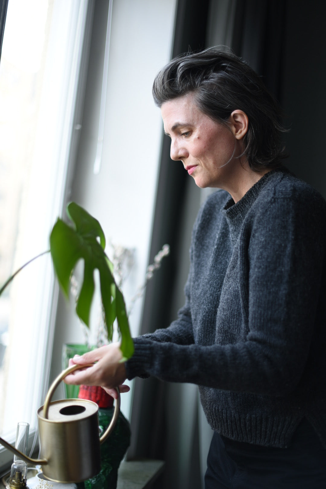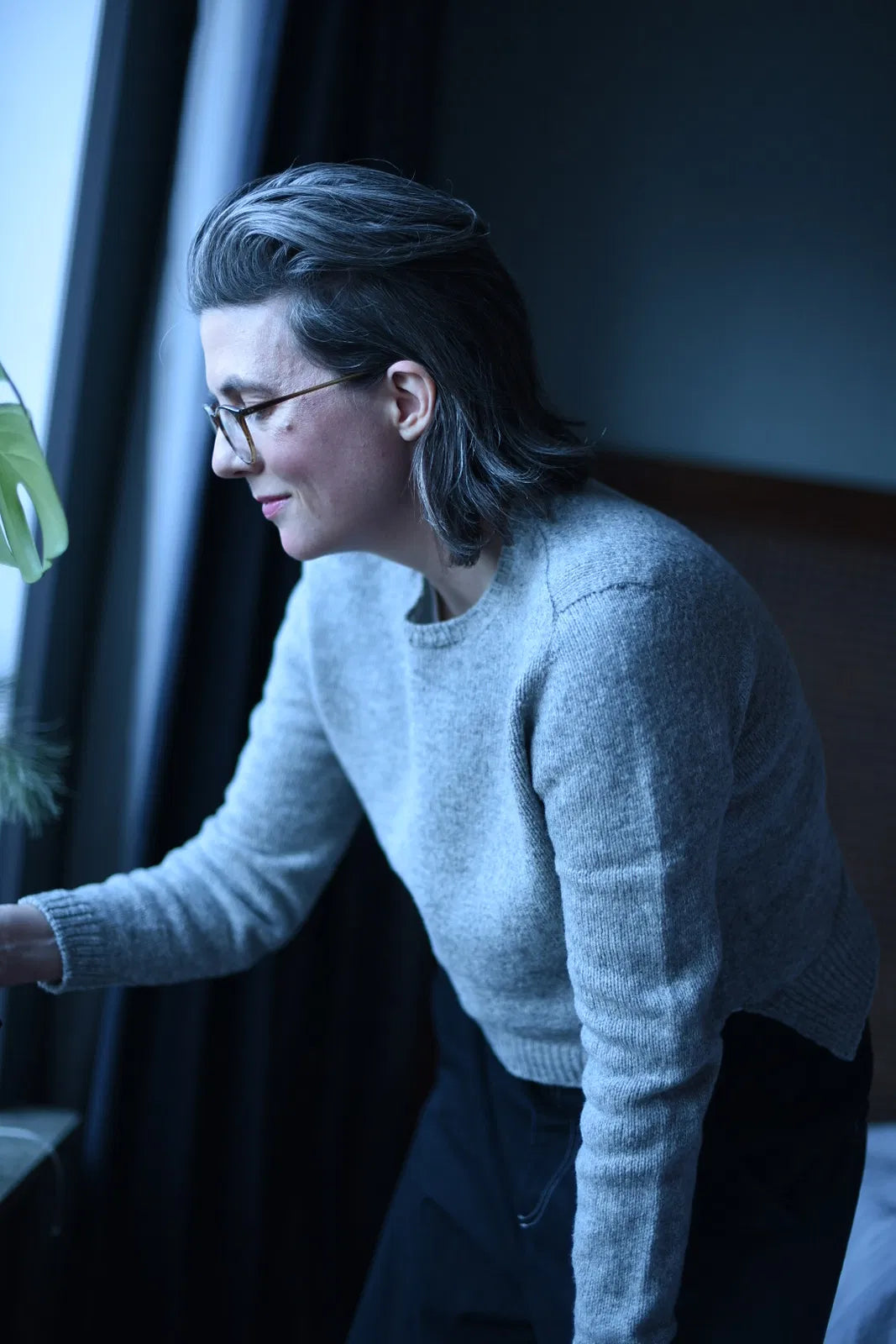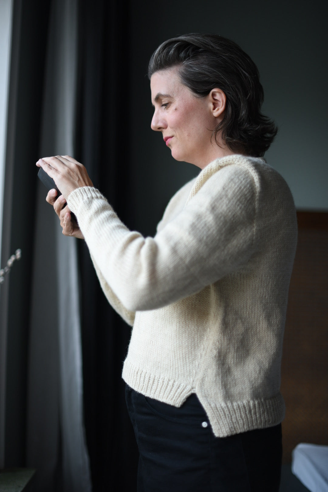 Tröjan stickas uppifrån och ner i ett stycke, med början vid halsringningen. Axellinjerna är integrerade i designen för att skapa struktur. Kropp och ärmar separeras efter oket, och kroppen avslutas med en sprundkant för en modern och tidlös känsla.